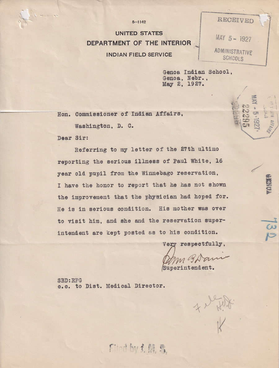 Letter from Sam B. Davis to the Commissioner of Indian Affairs, 2 May 1927; Folder: 22295-1927-732, Box 19; Central Classified Files, 1907–1939 (NAID 300324); Office of Indian Affairs; Record Group 75; National Archives and Records Administration-Washington, DC.