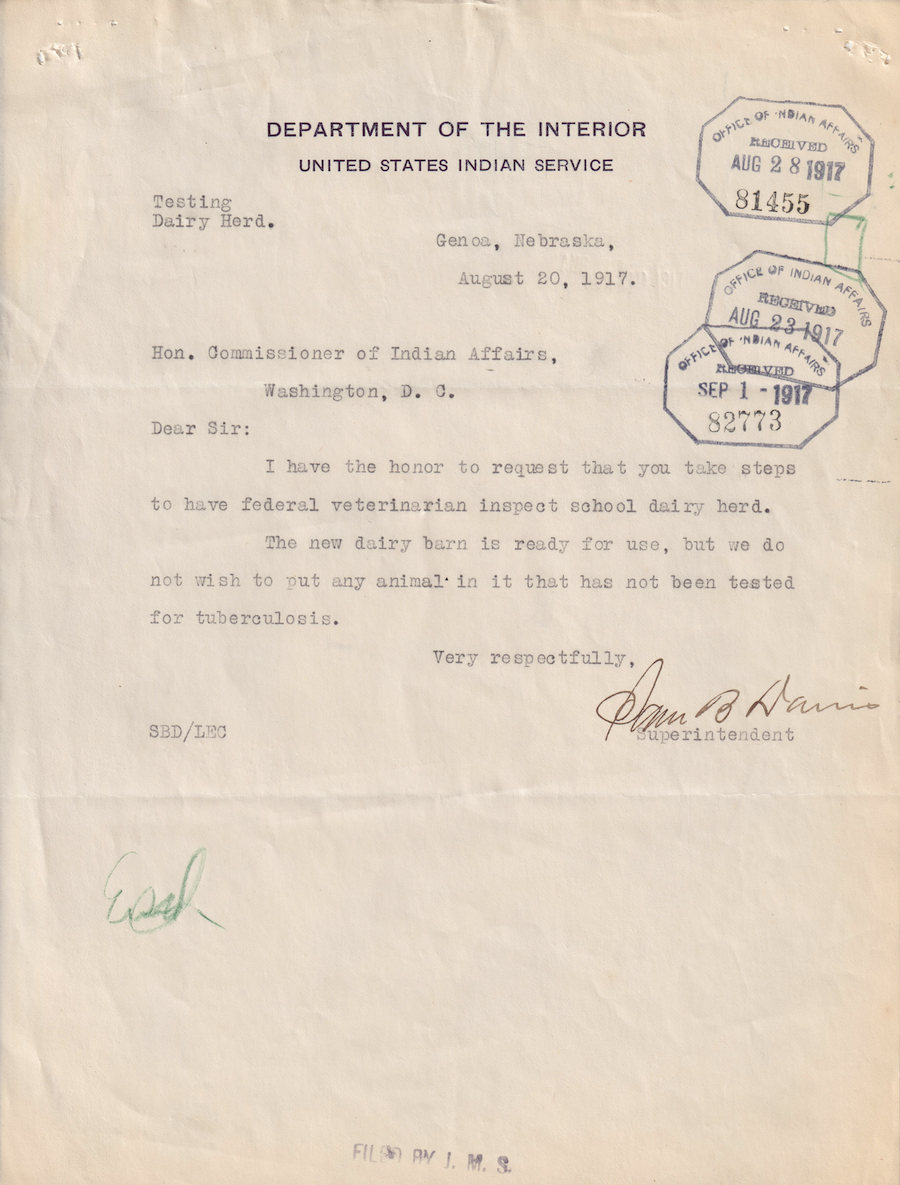 Letter from Sam B. Davis to the Commissioner of Indian Affairs, 20 Aug. 1917; Folder: 81455-1917-733, Box 19; Central Classified Files, 1907–1939 (NAID 300324); Office of Indian Affairs; Record Group 75; National Archives and Records Administration-Washington, DC.