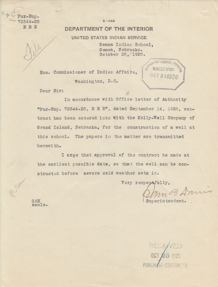 Letter from Sam B. Davis to the Commissioner of Indian Affairs, 20 Oct. 1920; Folder: 72344-1920-424, Box 17; Central Classified Files, 1907–1939 (NAID 300324); Office of Indian Affairs; Record Group 75; National Archives and Records Administration-Washington, DC.