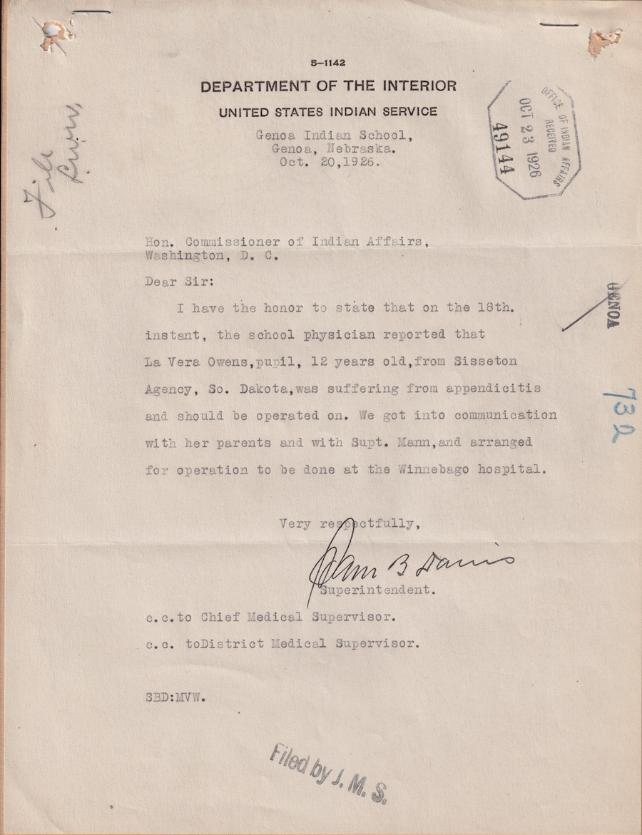 Letter from Sam B. Davis to the Commissioner of Indian Affairs, 21 Jan. 1927; Folder: 00-1927-732, Box 19; Central Classified Files, 1907–1939 (NAID 300324); Office of Indian Affairs; Record Group 75; National Archives and Records Administration-Washington, DC.