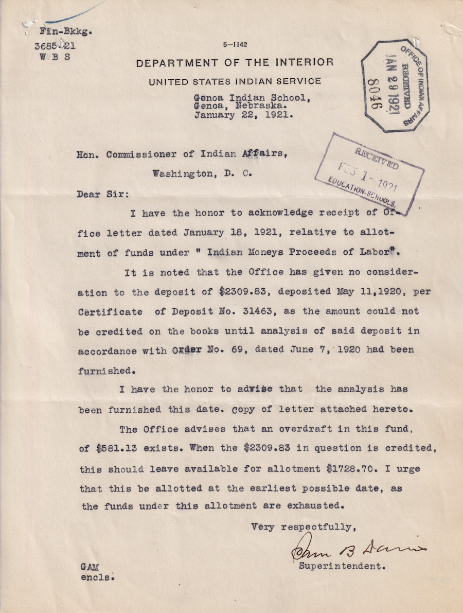 Letter from Sam B. Davis to the Commissioner of Indian Affairs, 22 Jan. 1921; Folder: 102442-1917-733, Box 19; Central Classified Files, 1907–1939 (NAID 300324); Office of Indian Affairs; Record Group 75; National Archives and Records Administration-Washington, DC.