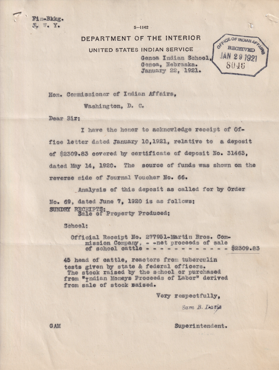 Letter from Sam B. Davis to the Commissioner of Indian Affairs, 22 Jan. 1921; Folder: 102442-1917-733, Box 19; Central Classified Files, 1907–1939 (NAID 300324); Office of Indian Affairs; Record Group 75; National Archives and Records Administration-Washington, DC.