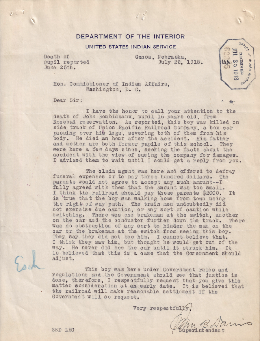 Letter from Sam B. Davis to Commissioner of Indian Affairs, 22 July 1918; Folder: 53707-1918-736, Box 20; Central Classified Files, 1907–1939 (NAID 300324); Office of Indian Affairs; Record Group 75; National Archives and Records Administration-Washington, DC.