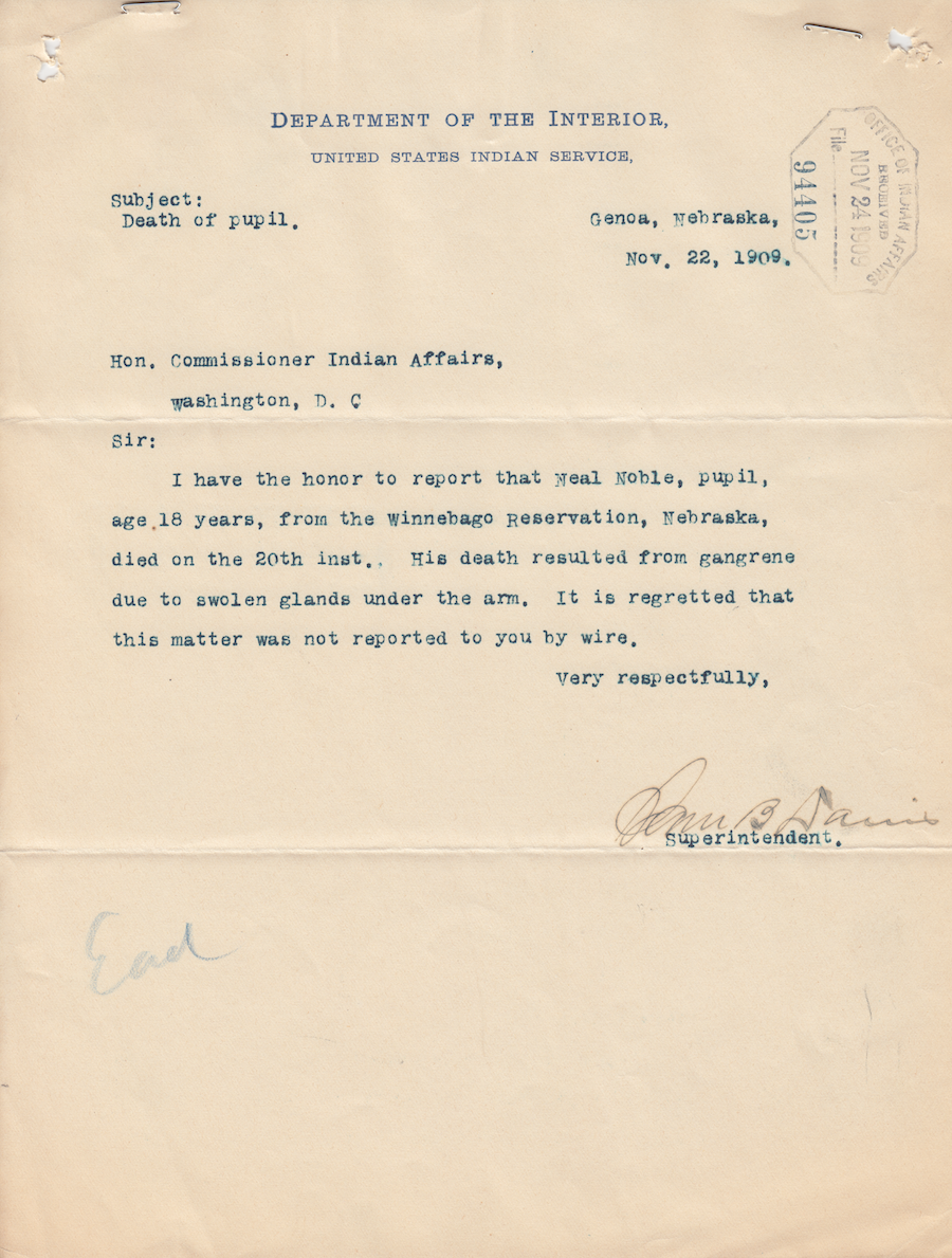 Letter from Sam B. Davis to the Commissioner of Indian Affairs, 22 Nov. 1909; Folder: 94405-1909-730, Box 19; Central Classified Files, 1907–1939 (NAID 300324); Office of Indian Affairs; Record Group 75; National Archives and Records Administration-Washington, DC.