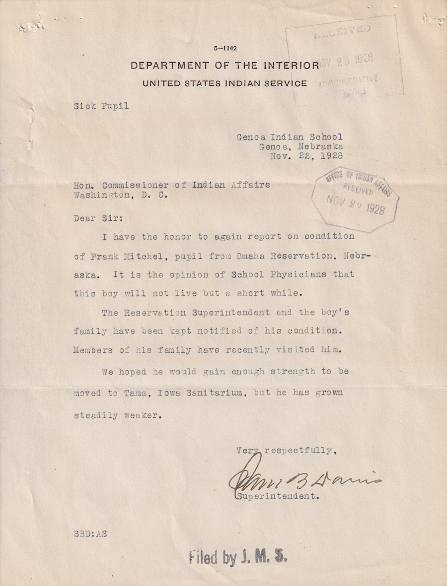Letter from Sam B. Davis to the Commissioner of Indian Affairs, 22 Nov. 1928; Folder: 53591-1928-732, Box 19; Central Classified Files, 1907–1939 (NAID 300324); Office of Indian Affairs; Record Group 75; National Archives and Records Administration-Washington, DC.