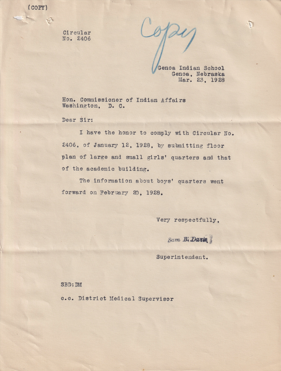 Letter from Sam B. Davis to the Commissioner of Indian Affairs, 23 Mar. 1928; Folder: 50978-1927-410, Box 17; Central Classified Files, 1907–1939 (NAID 300324); Office of Indian Affairs; Record Group 75; National Archives and Records Administration-Washington, DC.