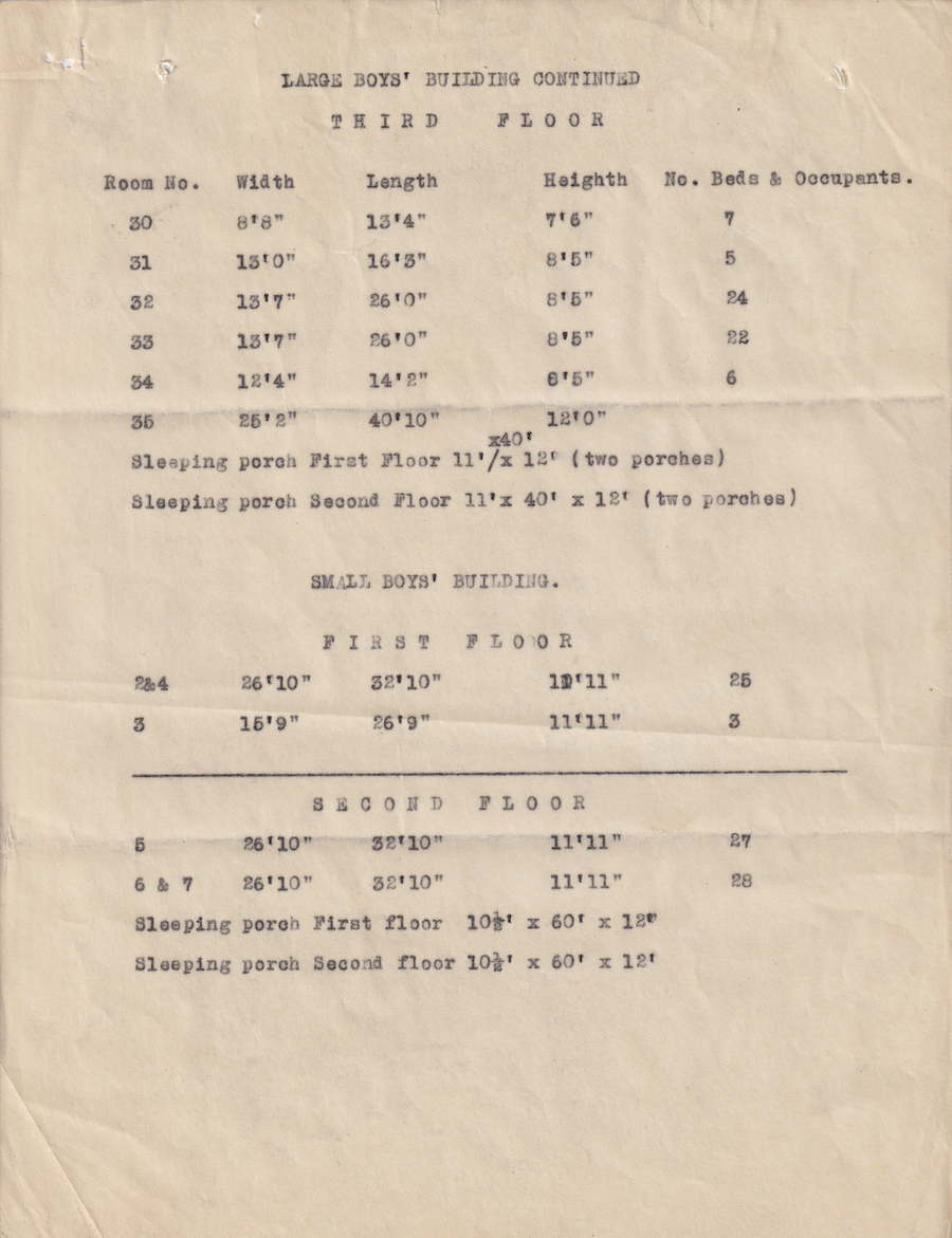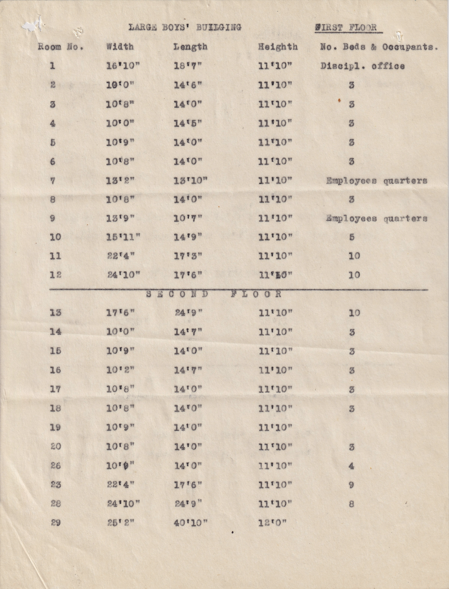 This letter includes dimensions and occupancy of all of the rooms in the boys' dormitories.