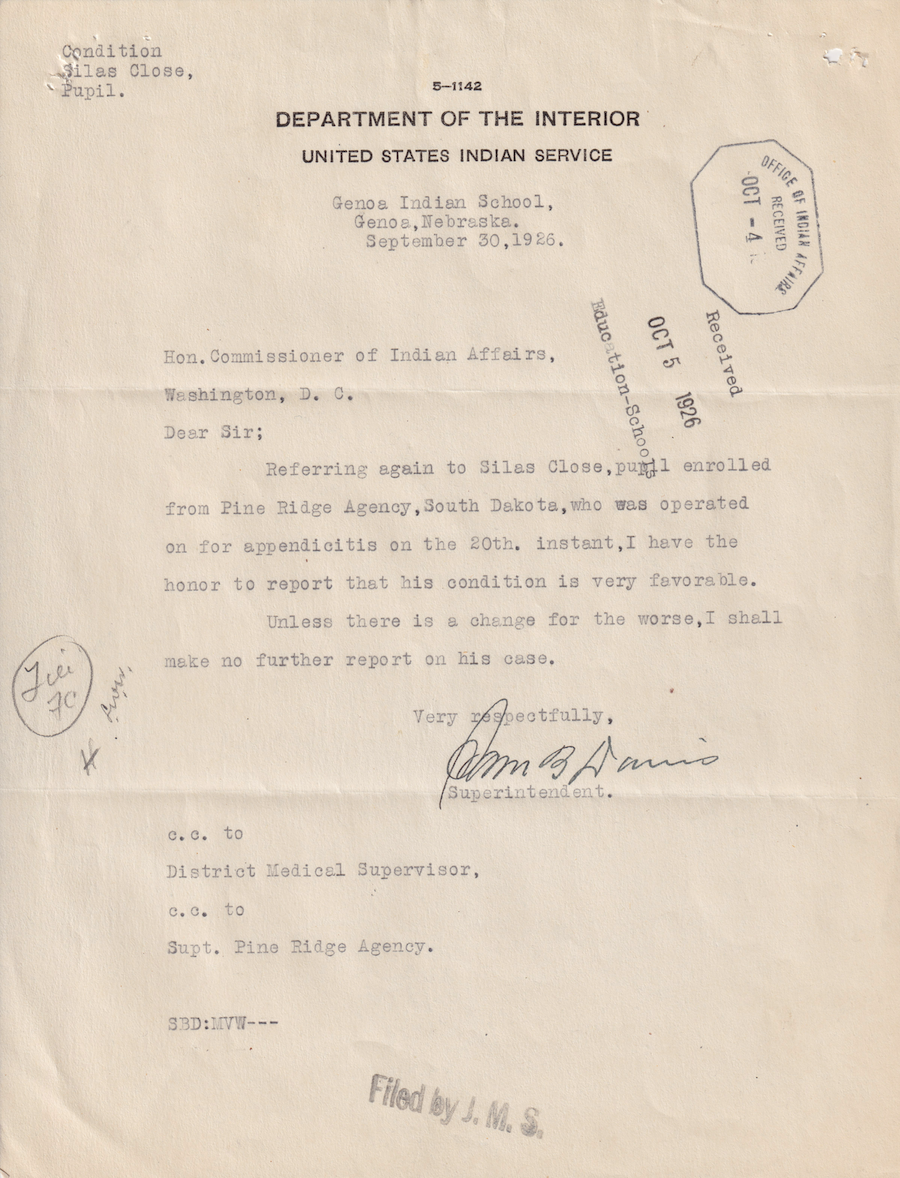 Letter from Sam B. Davis to the Commissioner of Indian Affairs, 23 Sept. 1926; Folder: 43932-1926-732, Box 19; Central Classified Files, 1907–1939 (NAID 300324); Office of Indian Affairs; Record Group 75; National Archives and Records Administration-Washington, DC.