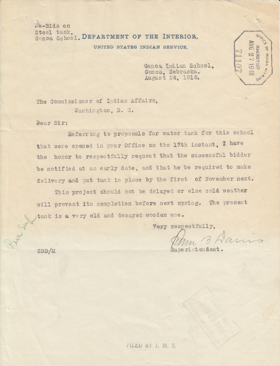 Letter from Sam B. Davis to the Commissioner of Indian Affairs, 24 Aug. 1918; Folder: 83054-1917-424, Box 17; Central Classified Files, 1907–1939 (NAID 300324); Office of Indian Affairs; Record Group 75; National Archives and Records Administration-Washington, DC.