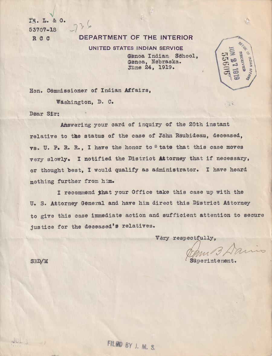 Letter from Sam B. Davis to Commissioner of Indian Affairs, 24 June 1919; Folder: 53707-1918-736, Box 20; Central Classified Files, 1907–1939 (NAID 300324); Office of Indian Affairs; Record Group 75; National Archives and Records Administration-Washington, DC.