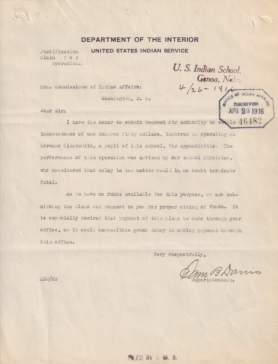 Letter from Sam B. Davis to the Commissioner of Indian Affairs, 26 Apr. 1916; Folder: 28797-1916-732, Box 19; Central Classified Files, 1907–1939 (NAID 300324); Office of Indian Affairs; Record Group 75; National Archives and Records Administration-Washington, DC.