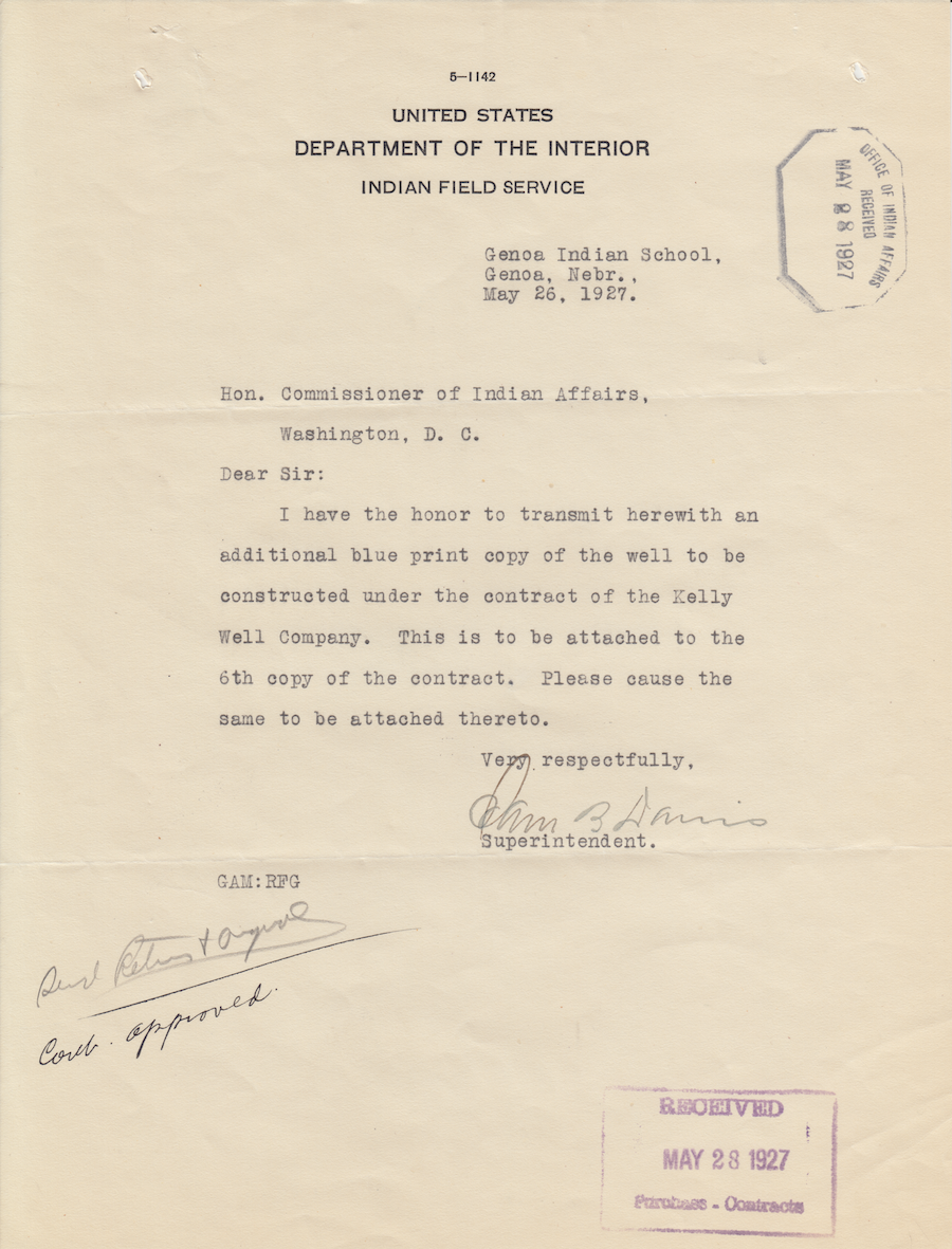 Letter from Sam B. Davis to the Commissioner of Indian Affairs, 26 May 1927; Folder: 50496-1926-424, Box 17; Central Classified Files, 1907–1939 (NAID 300324); Office of Indian Affairs; Record Group 75; National Archives and Records Administration-Washington, DC.