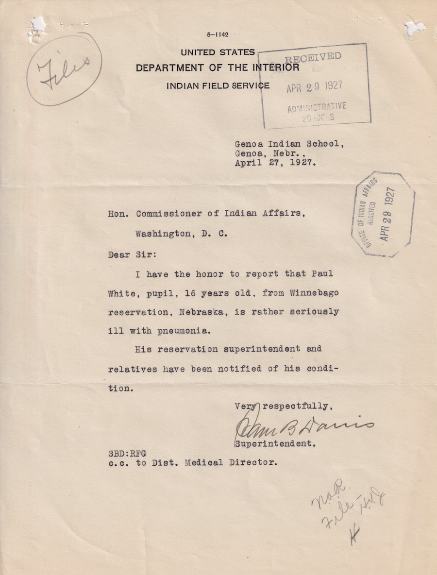 Letter from Sam B. Davis to the Commissioner of Indian Affairs, 27 Apr. 1927; Folder: 22295-1927-732, Box 19; Central Classified Files, 1907–1939 (NAID 300324); Office of Indian Affairs; Record Group 75; National Archives and Records Administration-Washington, DC.