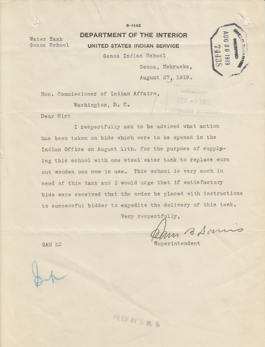 Letter from Sam B. Davis to the Commissioner of Indian Affairs, 27 Aug. 1919; Folder: 83054-1917-424, Box 17; Central Classified Files, 1907–1939 (NAID 300324); Office of Indian Affairs; Record Group 75; National Archives and Records Administration-Washington, DC.