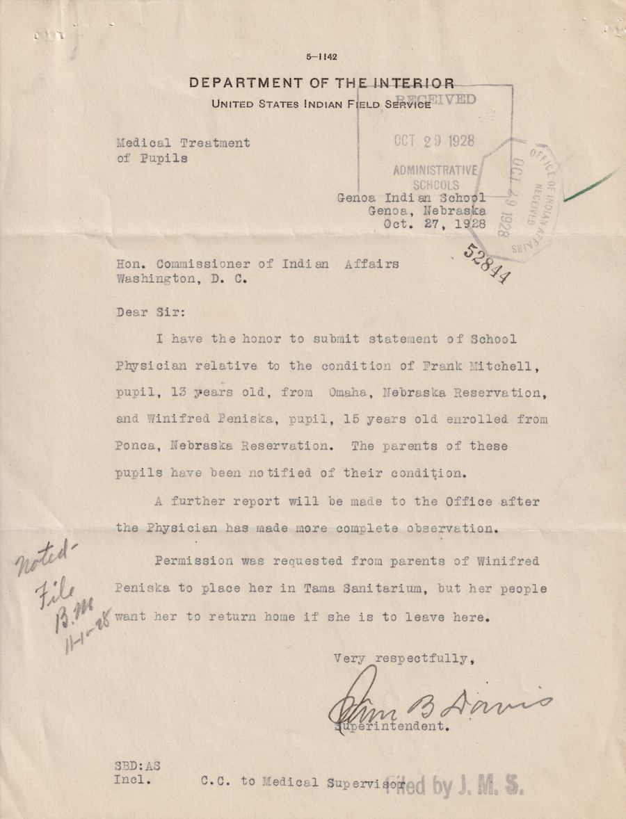 Letter from Sam B. Davis to the Commissioner of Indian Affairs, 27 Oct. 1928; Folder: 52844-1928-732, Box 19; Central Classified Files, 1907–1939 (NAID 300324); Office of Indian Affairs; Record Group 75; National Archives and Records Administration-Washington, DC.