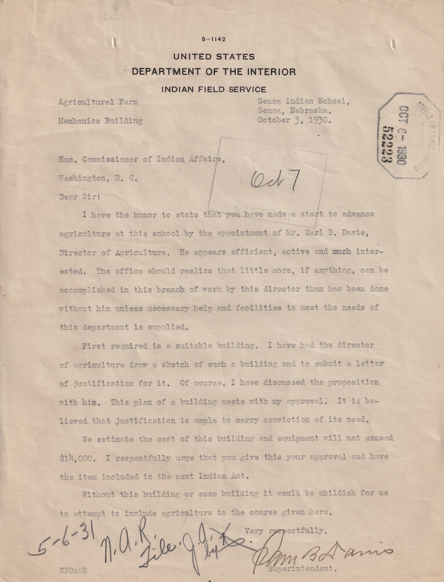 Letter from Sam B. Davis to the Commissioner of Indian Affairs, 3 Oct. 1930; Folder: 52223-1930-410, Box 17; Central Classified Files, 1907–1939 (NAID 300324); Office of Indian Affairs; Record Group 75; National Archives and Records Administration-Washington, DC.