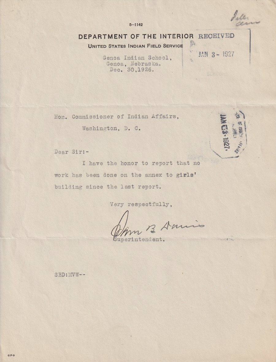 Letter from Sam B. Davis to the Commissioner of Indian Affairs, 30 Dec. 1926; Folder: 00-1926-410, Box 17; Central Classified Files, 1907–1939 (NAID 300324); Office of Indian Affairs; Record Group 75; National Archives and Records Administration-Washington, DC.