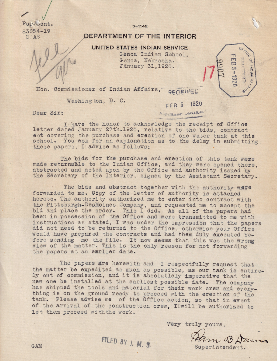 Letter from Sam B. Davis to the Commissioner of Indian Affairs, 31 Jan. 1920; Folder: 83054-1917-424, Box 17; Central Classified Files, 1907–1939 (NAID 300324); Office of Indian Affairs; Record Group 75; National Archives and Records Administration-Washington, DC.