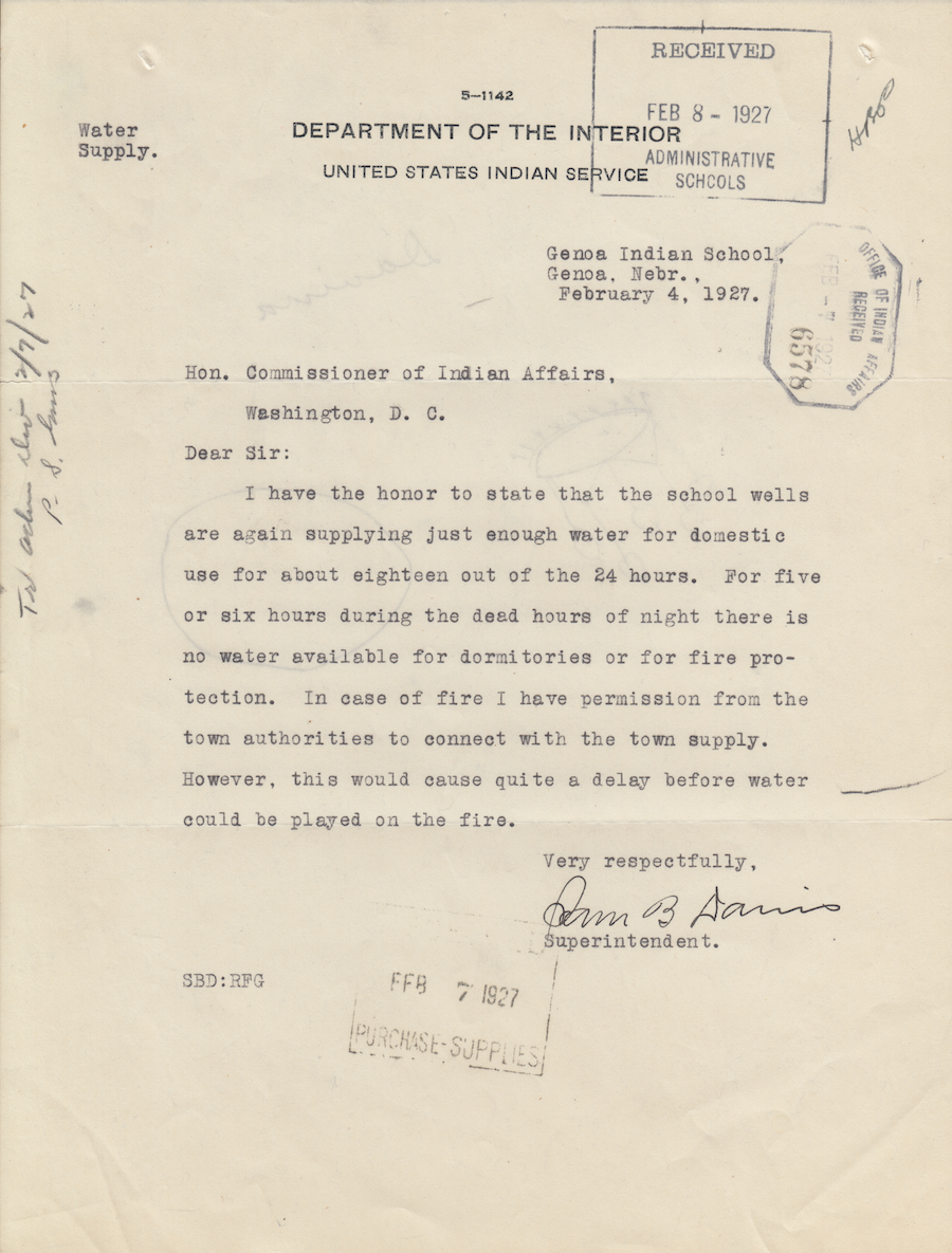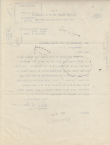 Letter from Sam B. Davis to the Commissioner of Indian Affairs, 4 Feb. 1927; Folder: 50496-1926-424, Box 17; Central Classified Files, 1907–1939 (NAID 300324); Office of Indian Affairs; Record Group 75; National Archives and Records Administration-Washington, DC.
