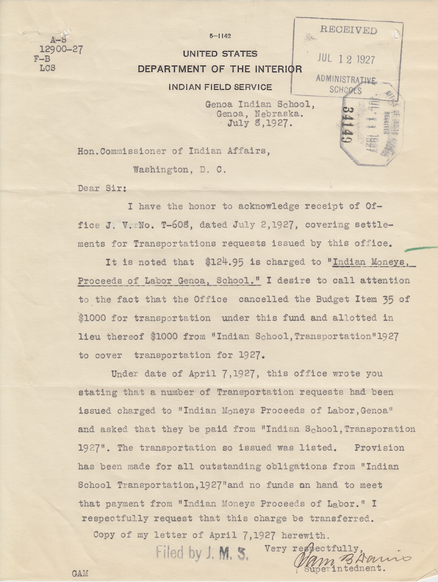 Letter from Sam B. Davis to the Commissioner of Indian Affairs, 5 July 1927; Folder: 50496-1926-424, Box 17; Central Classified Files, 1907–1939 (NAID 300324); Office of Indian Affairs; Record Group 75; National Archives and Records Administration-Washington, DC.