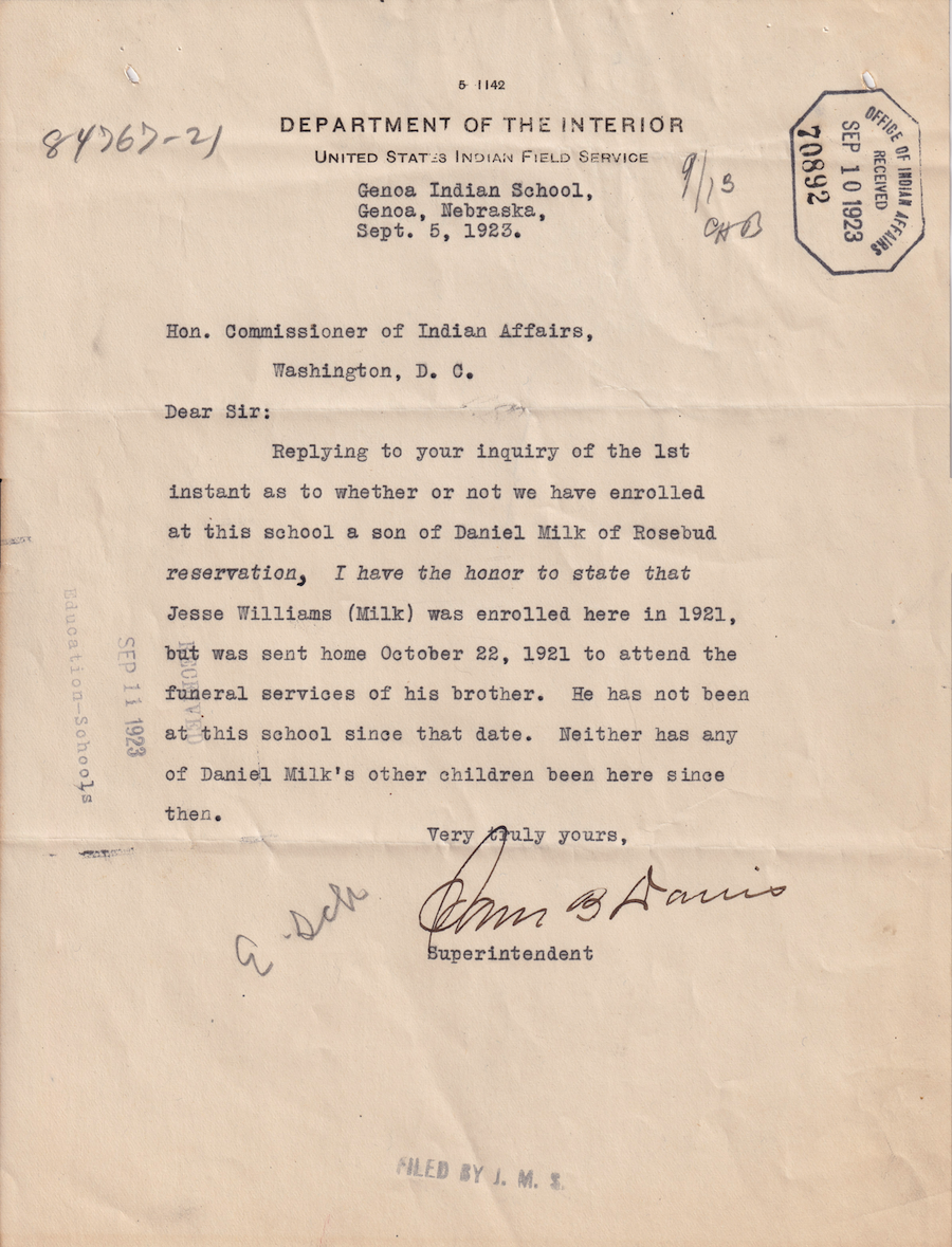 Letter from Sam B. Davis to Commissioner of Indian Affairs, 5 Sept. 1923; Folder: 84767-1921-736, Box 20; Central Classified Files, 1907–1939 (NAID 300324); Office of Indian Affairs; Record Group 75; National Archives and Records Administration-Washington, DC.