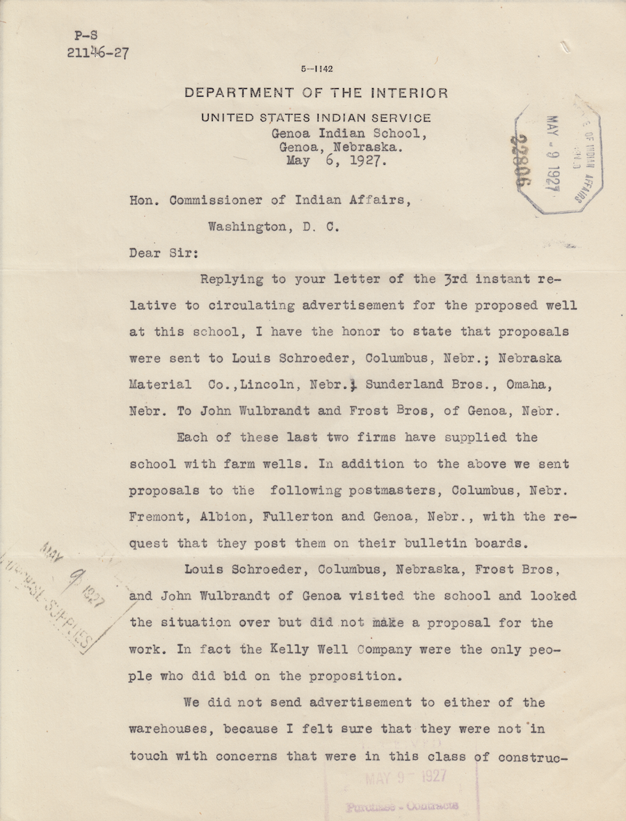Letter from Sam B. Davis to the Commissioner of Indian Affairs, 6 May 1927; Folder: 50496-1926-424, Box 17; Central Classified Files, 1907–1939 (NAID 300324); Office of Indian Affairs; Record Group 75; National Archives and Records Administration-Washington, DC.