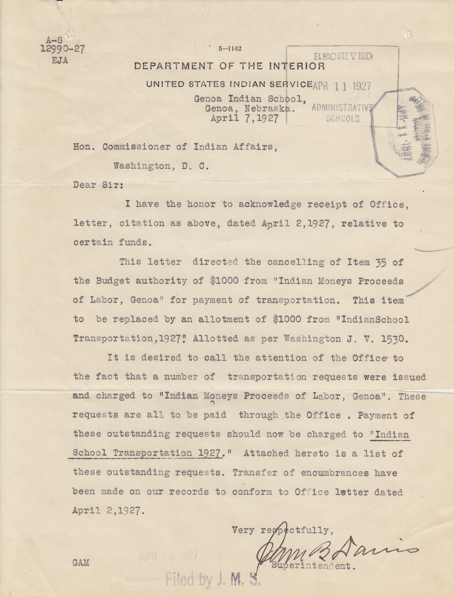 Letter from Sam B. Davis to Commissioner of Indian Affairs, 7 Apr. 1927; Folder: 50496-1926-424, Box 17; Central Classified Files, 1907–1939 (NAID 300324); Office of Indian Affairs; Record Group 75; National Archives and Records Administration-Washington, DC.