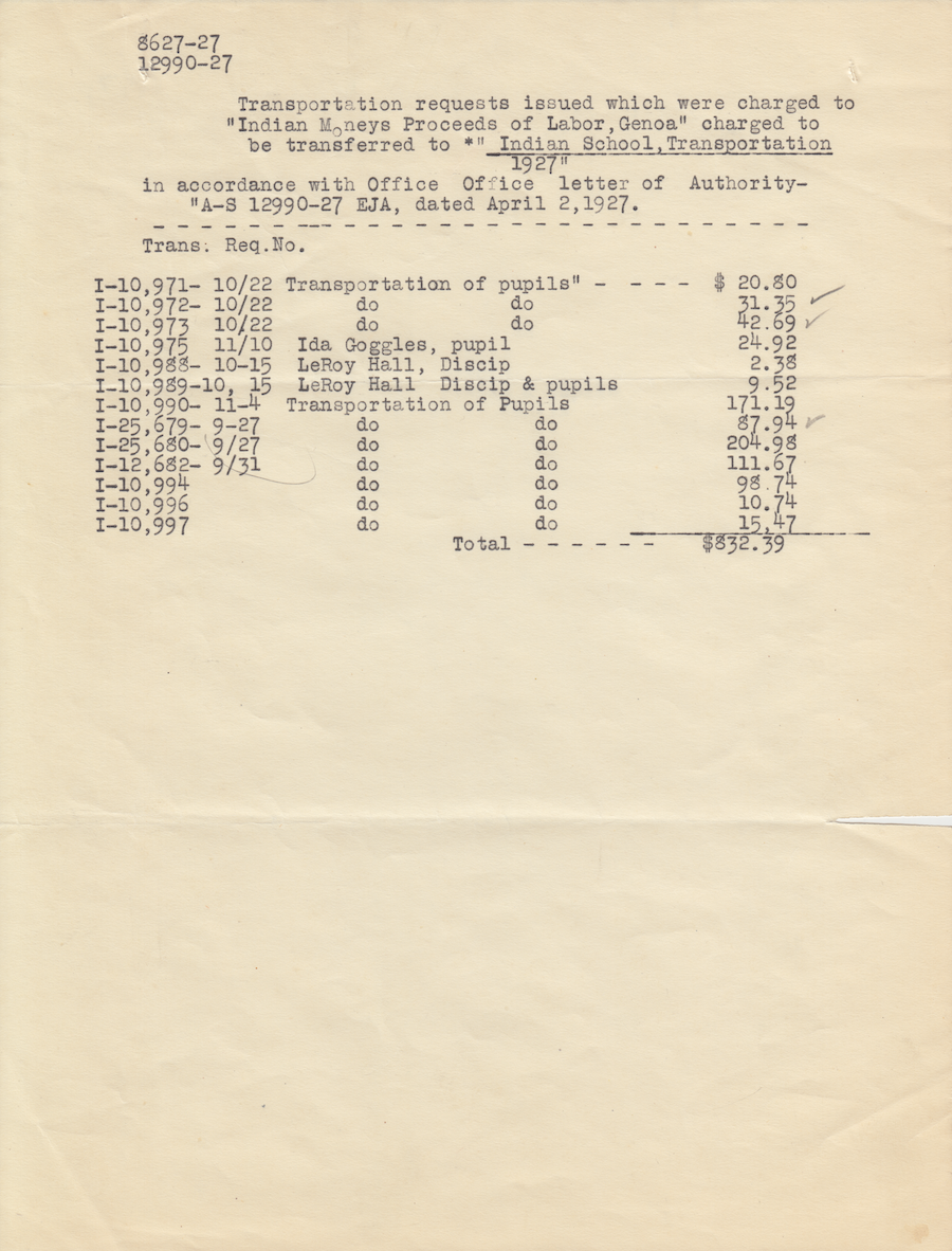 Regarding the request to charge transportation requests to "Indian School Transportation 1927."Description: