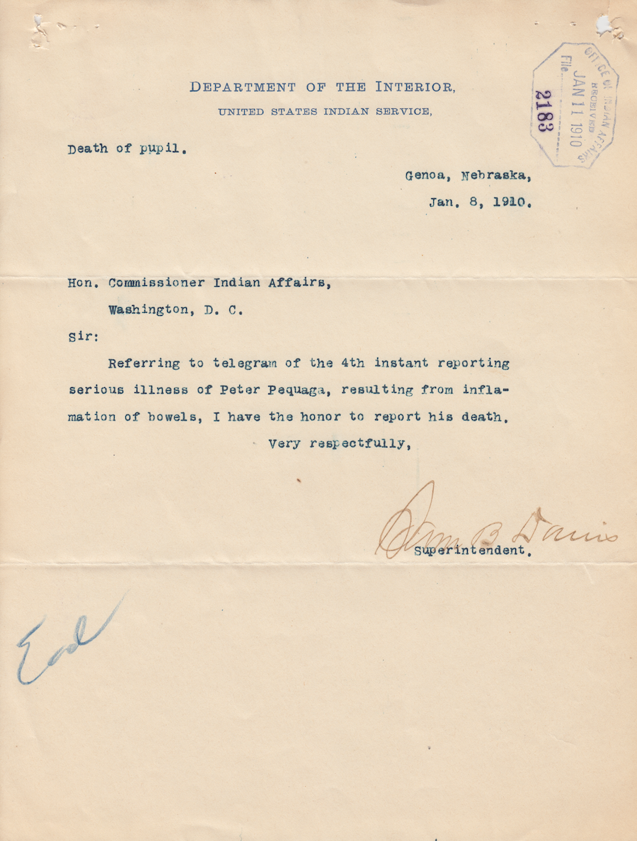 Letter from Sam B. Davis to the Commissioner of Indian Affairs, 8 Jan. 1910; Folder: 929-1910-730, Box 19; Central Classified Files, 1907–1939 (NAID 300324); Office of Indian Affairs; Record Group 75; National Archives and Records Administration-Washington, DC.