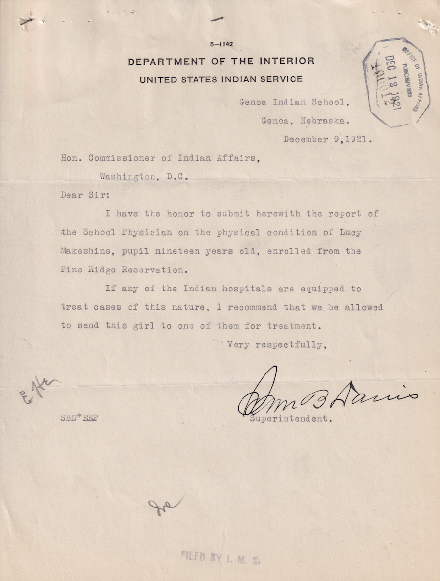 Letter from Sam B. Davis to the Commissioner of Indian Affairs, 9 Dec. 1921; Folder: 100012-1921-732, Box 19; Central Classified Files, 1907–1939 (NAID 300324); Office of Indian Affairs; Record Group 75; National Archives and Records Administration-Washington, DC.