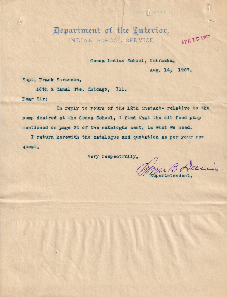 Letter from Sam B. Davis to Frank Sorenson, 14 Aug. 1907; Folder: 73700-1907-420, Box 17; Central Classified Files, 1907–1939 (NAID 300324); Office of Indian Affairs; Record Group 75; National Archives and Records Administration-Washington, DC.