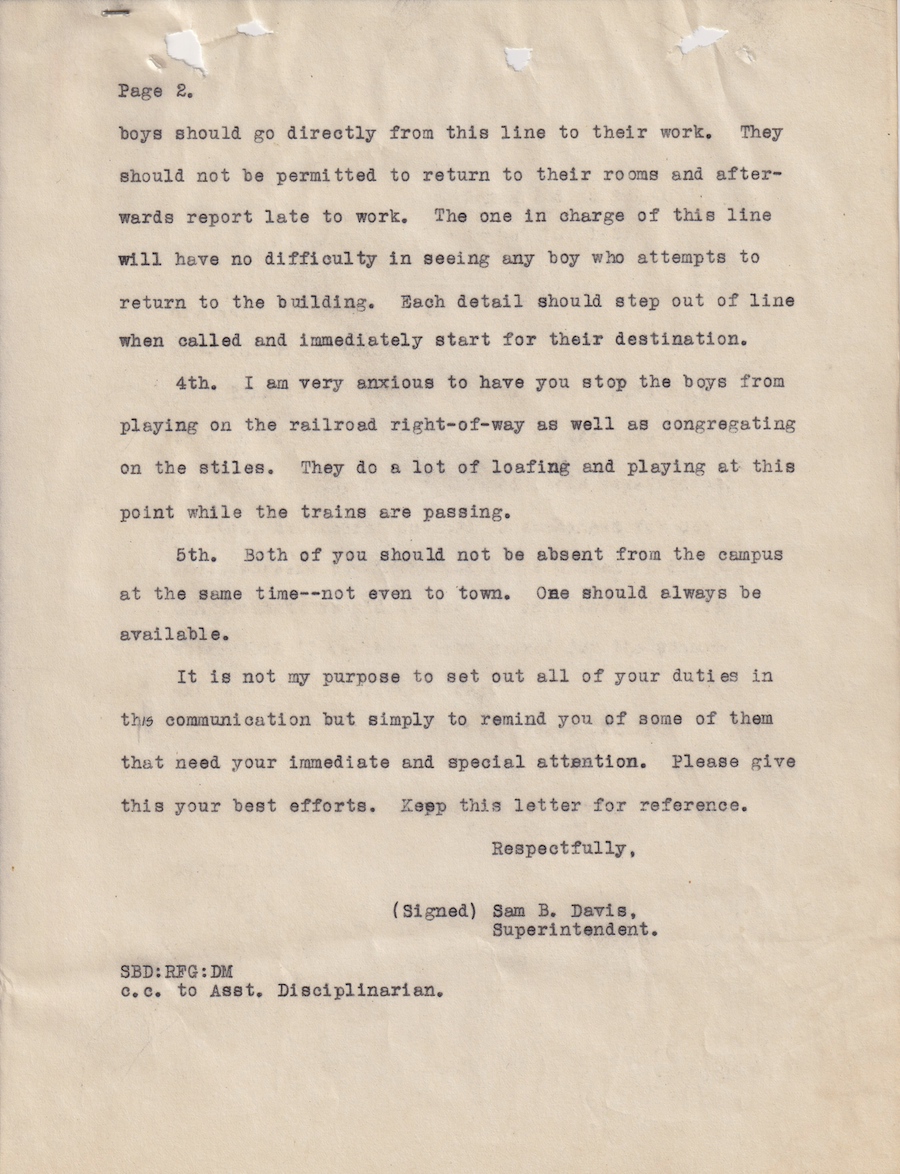 Regarding duties that need immediate and special attention for the disciplinarian of the large boys.Identifier: