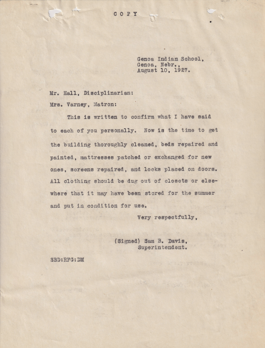 Letter from Sam B. Davis to Mr. Hall and Mrs. Varney, 10 Aug. 1927; Folder: 51800-1927-410, Box 17; Central Classified Files, 1907–1939 (NAID 300324); Office of Indian Affairs; Record Group 75; National Archives and Records Administration-Washington, DC.