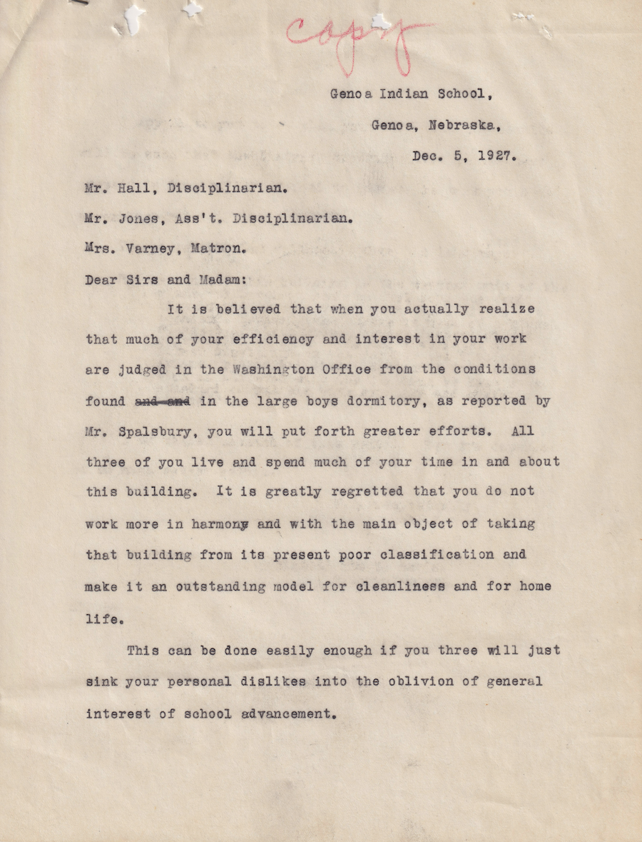 Letter from Sam B. Davis to Mr. Hall, Mr. Jones and Mrs. Varney, 5 Dec. 1927; Folder: 51800-1927-410, Box 17; Central Classified Files, 1907–1939 (NAID 300324); Office of Indian Affairs; Record Group 75; National Archives and Records Administration-Washington, DC.