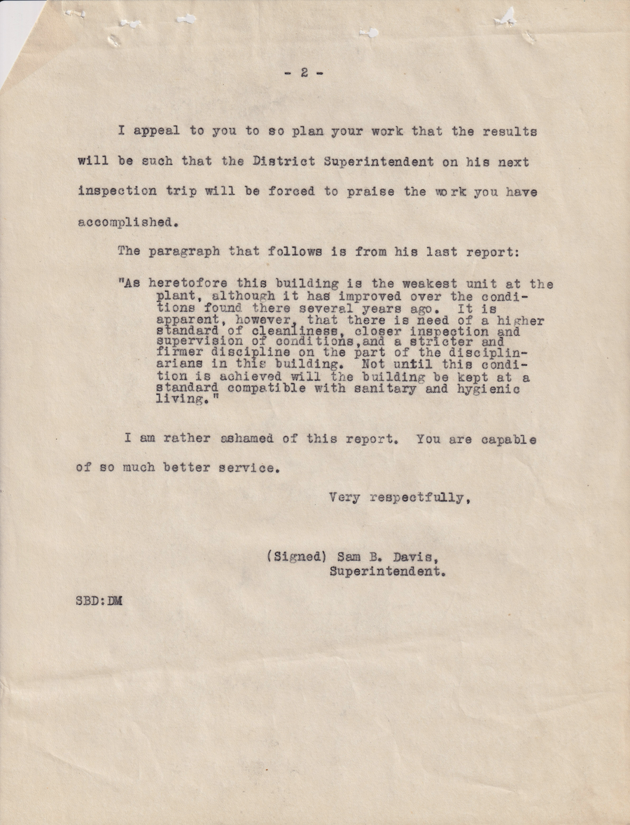 Regarding the conditions at the large boys dormitory and the need for cleanliness and discipline according to inspection.Identifier: