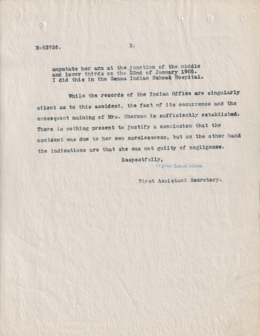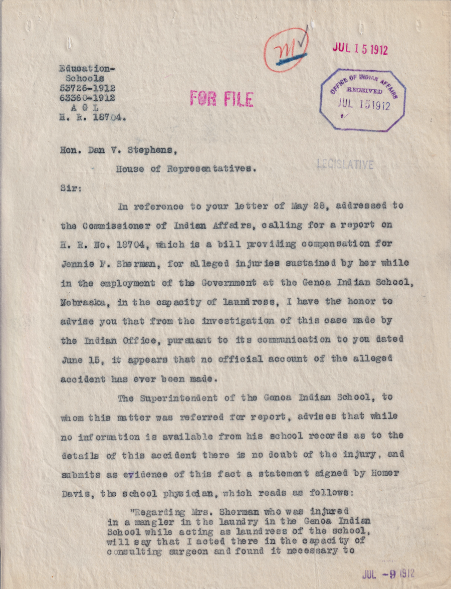 Letter from Samual Adams to Dan V. Stephens, 15 July 1912; Folder: 53726-1912-732, Box 19; Central Classified Files, 1907–1939 (NAID 300324); Office of Indian Affairs; Record Group 75; National Archives and Records Administration-Washington, DC.