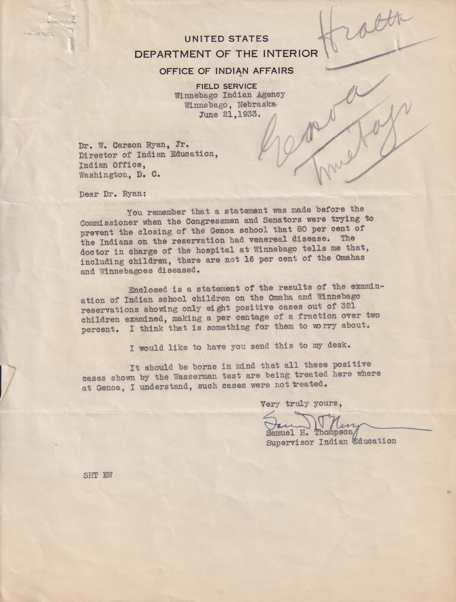 Letter from Samuel H. Thompson to W. Carson Ryan, 21 June 1933; Folder: 45539-1930-800, Box 20; Central Classified Files, 1907–1939 (NAID 300324); Office of Indian Affairs; Record Group 75; National Archives and Records Administration-Washington, DC.
