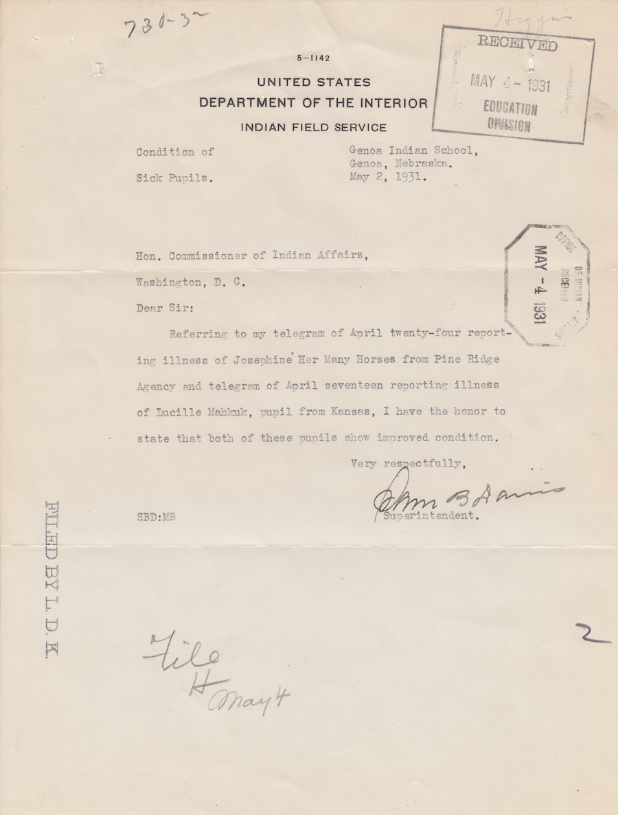 Letter from San B. Davis to the Commissioner of Indian Affairs, 2 May 1931