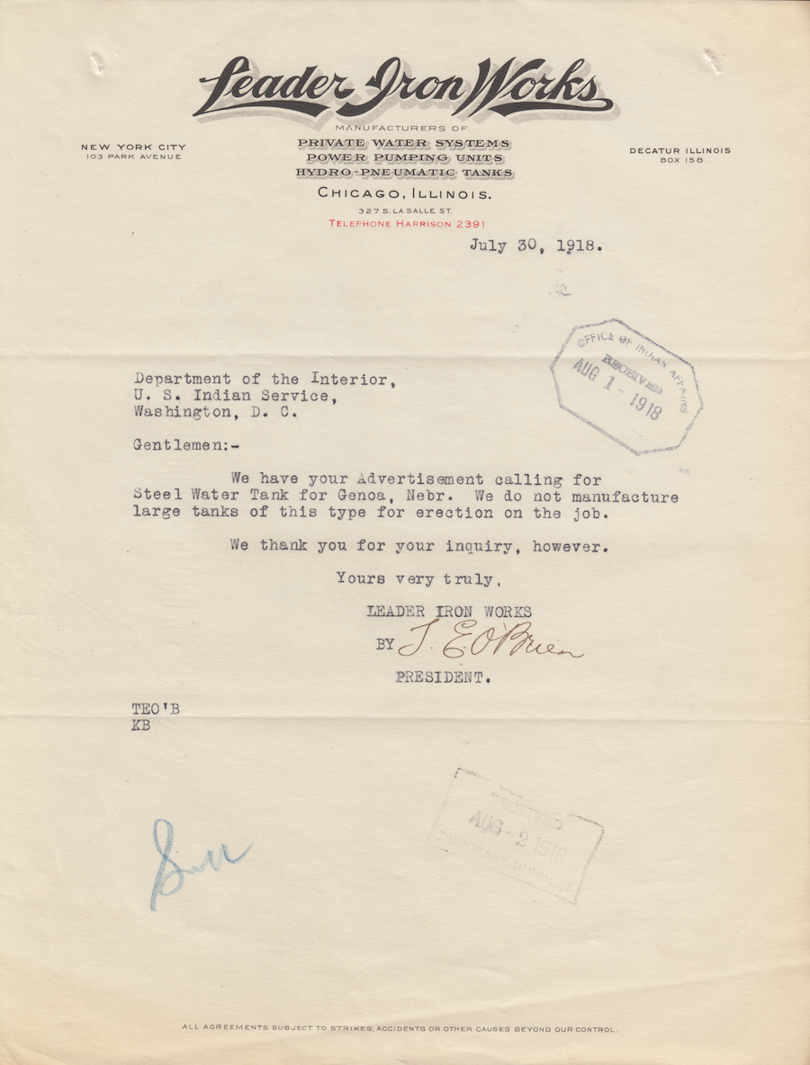 Letter from T. E. O'Brien to the Department of the Interior, 30 July 1918; Folder: 83054-1917-424, Box 17; Central Classified Files, 1907–1939 (NAID 300324); Office of Indian Affairs; Record Group 75; National Archives and Records Administration-Washington, DC.