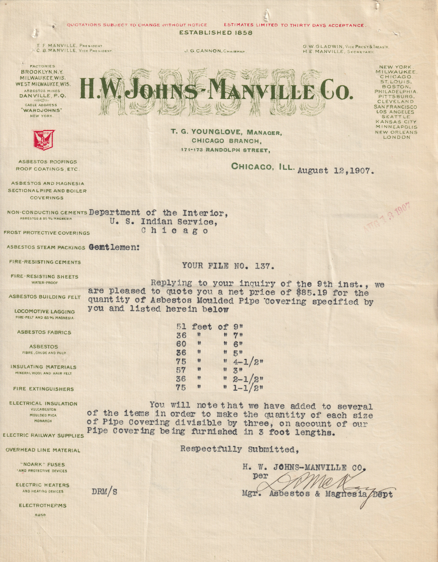 Letter from T. G. Younglove to the Department of the Interior, 12 Aug, 1907; Folder: 73700-1907-420, Box 17; Central Classified Files, 1907–1939 (NAID 300324); Office of Indian Affairs; Record Group 75; National Archives and Records Administration-Washington, DC.