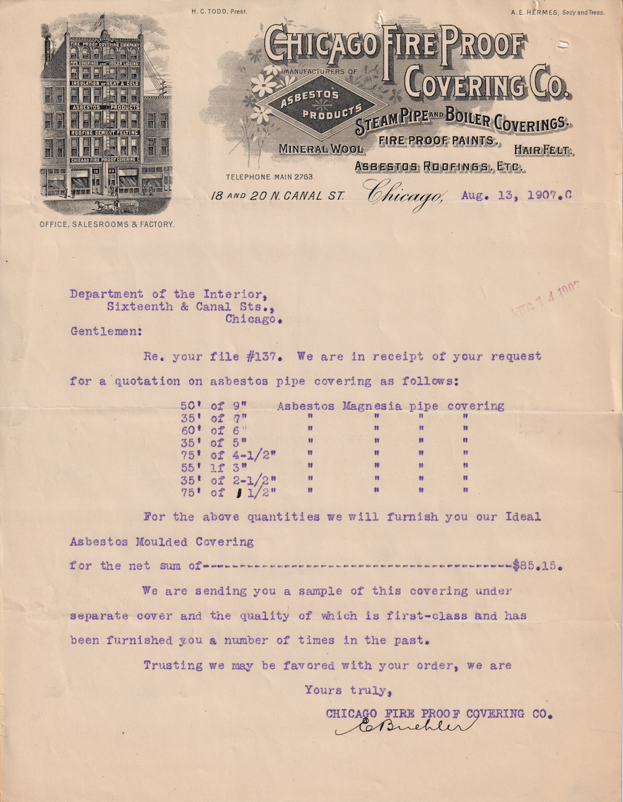 Letter from the Chicago Fire Proof Covering Co. to the Department of the Interior, 13 Aug. 1907; Folder: 73700-1907-420, Box 17; Central Classified Files, 1907–1939 (NAID 300324); Office of Indian Affairs; Record Group 75; National Archives and Records Administration-Washington, DC.