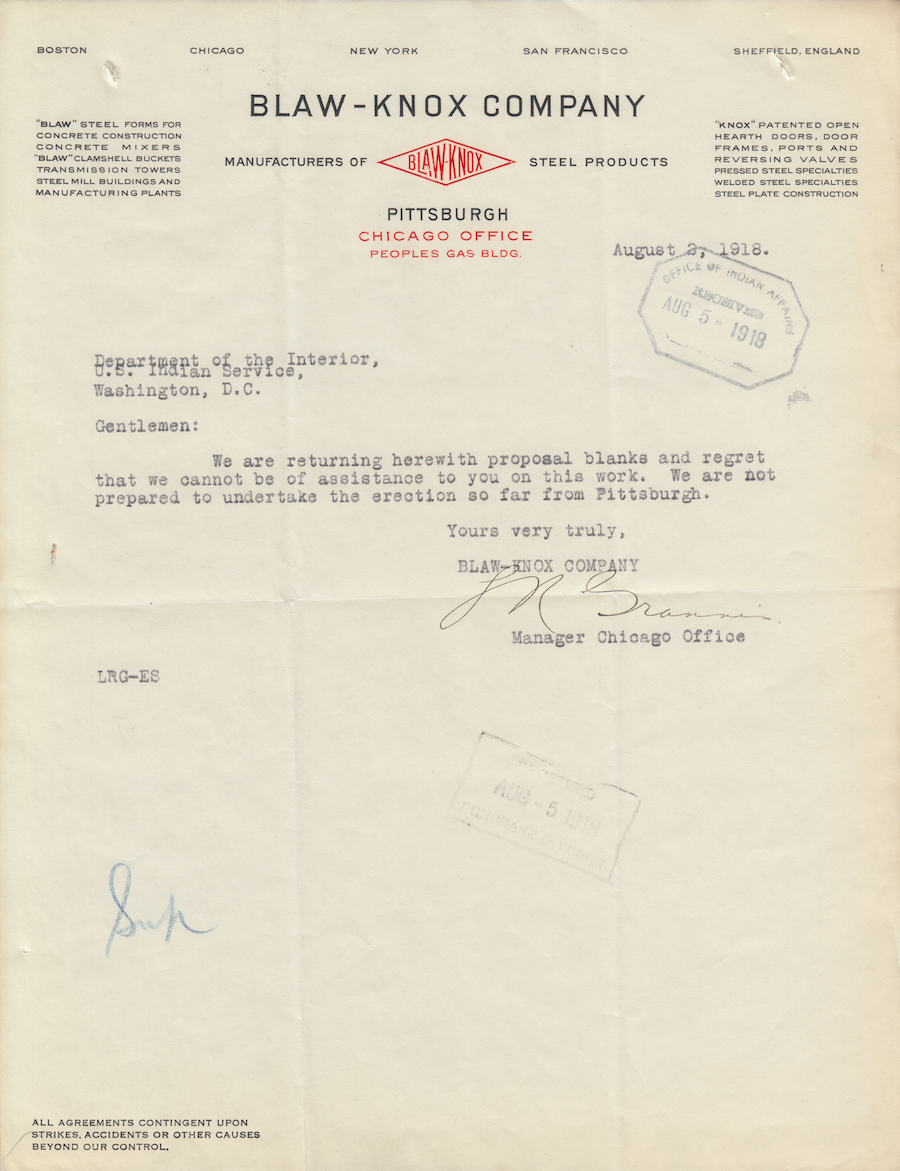 Letter from unknown to the Department of the Interior, 2 Aug. 1918; Folder: 83054-1917-424, Box 17; Central Classified Files, 1907–1939 (NAID 300324); Office of Indian Affairs; Record Group 75; National Archives and Records Administration-Washington, DC.