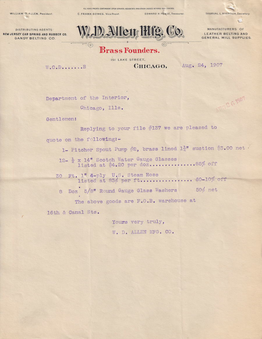 Regarding an itemized quote for a pitcher spout pump, scotch water gauge glasses, a steam hose, and round gauge glass washers.Identifier: