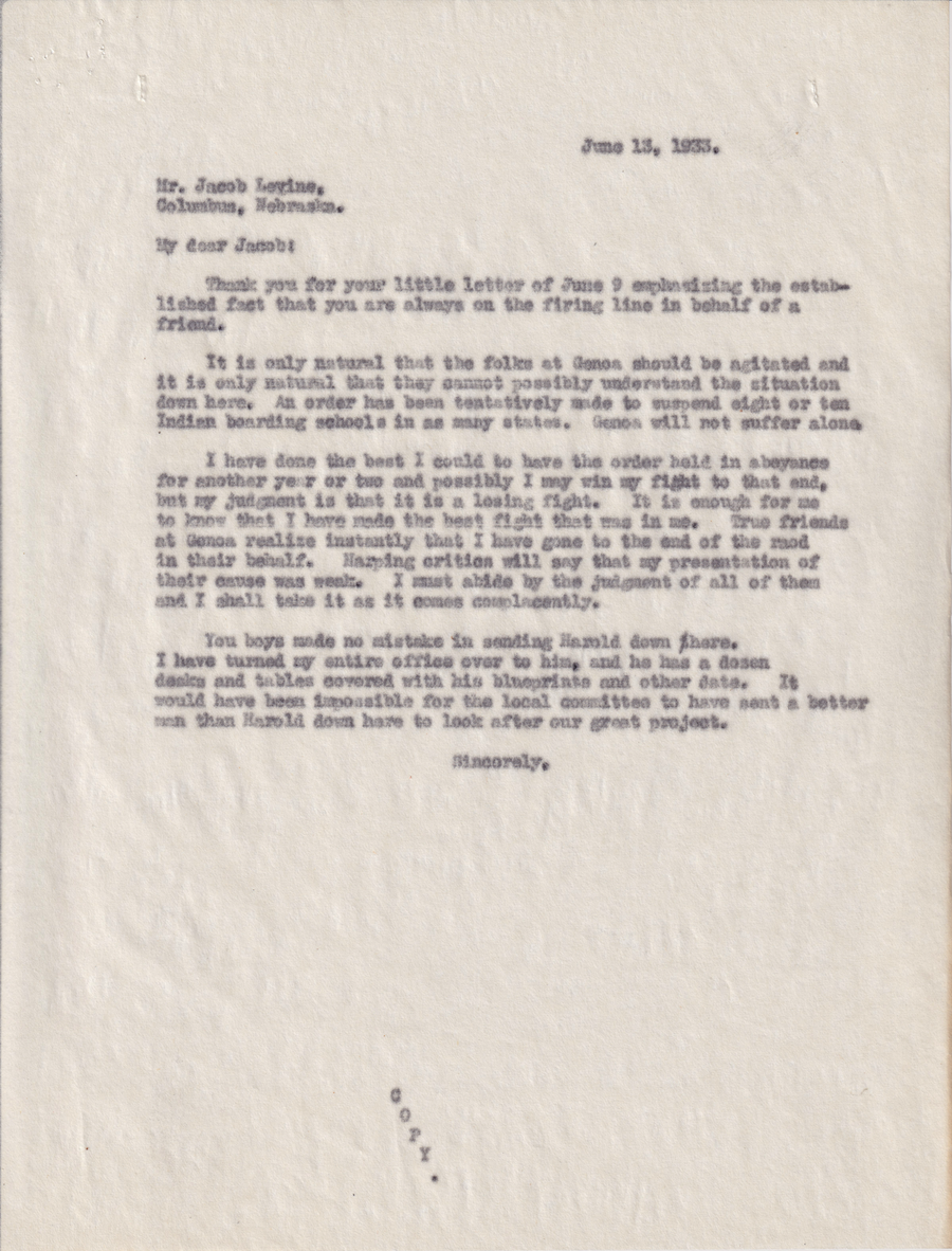 Letter from unknown to Jacob Levine, 13 June 1933; Folder: 45539-1930-800, Box 20; Central Classified Files, 1907–1939 (NAID 300324); Office of Indian Affairs; Record Group 75; National Archives and Records Administration-Washington, DC.