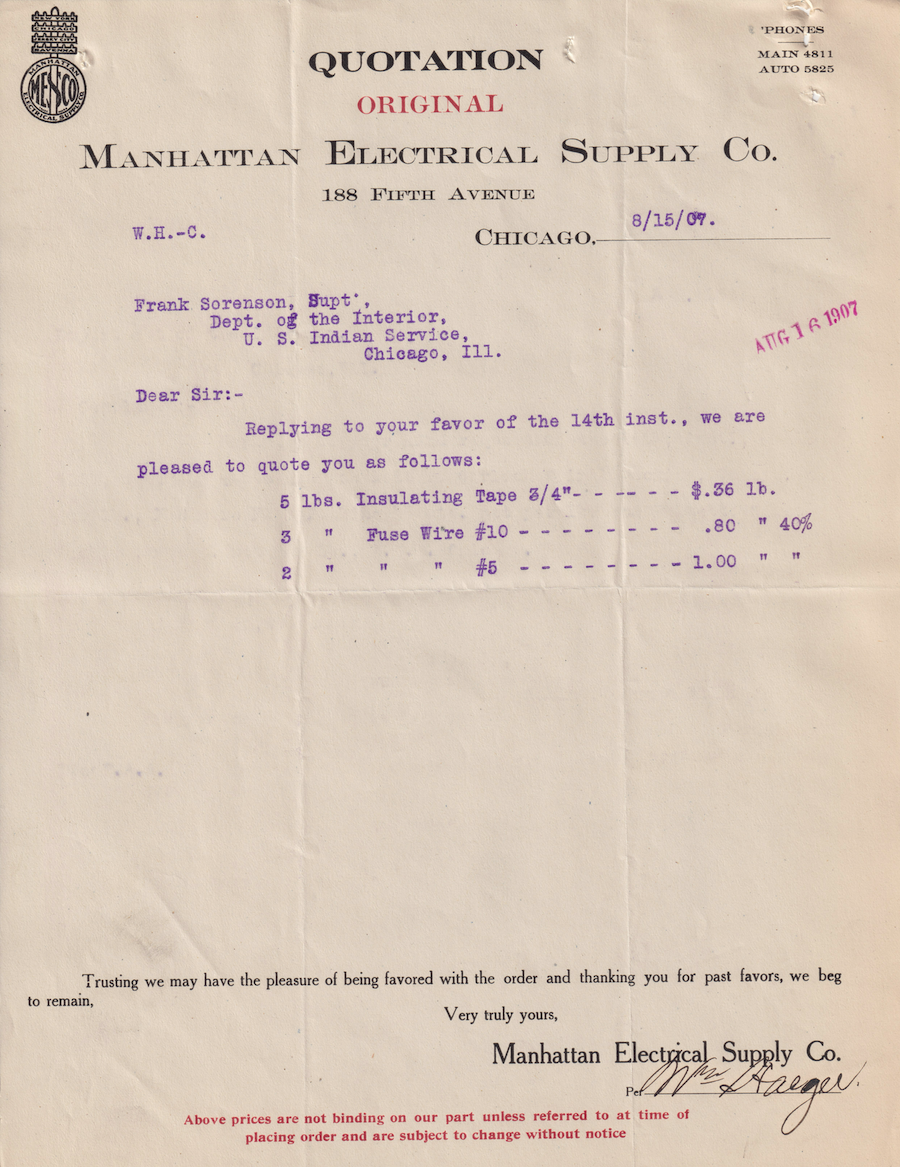 Letter from William Haeger to Frank Sorenson, 15 Aug. 1907; Folder: 73700-1907-420, Box 17; Central Classified Files, 1907–1939 (NAID 300324); Office of Indian Affairs; Record Group 75; National Archives and Records Administration-Washington, DC.