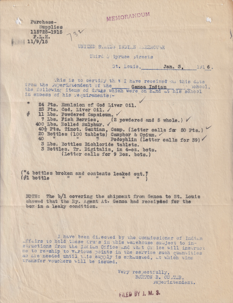 Memorandum from Burton B. C. to unknown, 3 Jan. 1916; Folder: 115725-1915-732, Box 19; Central Classified Files, 1907–1939 (NAID 300324); Office of Indian Affairs; Record Group 75; National Archives and Records Administration-Washington, DC.