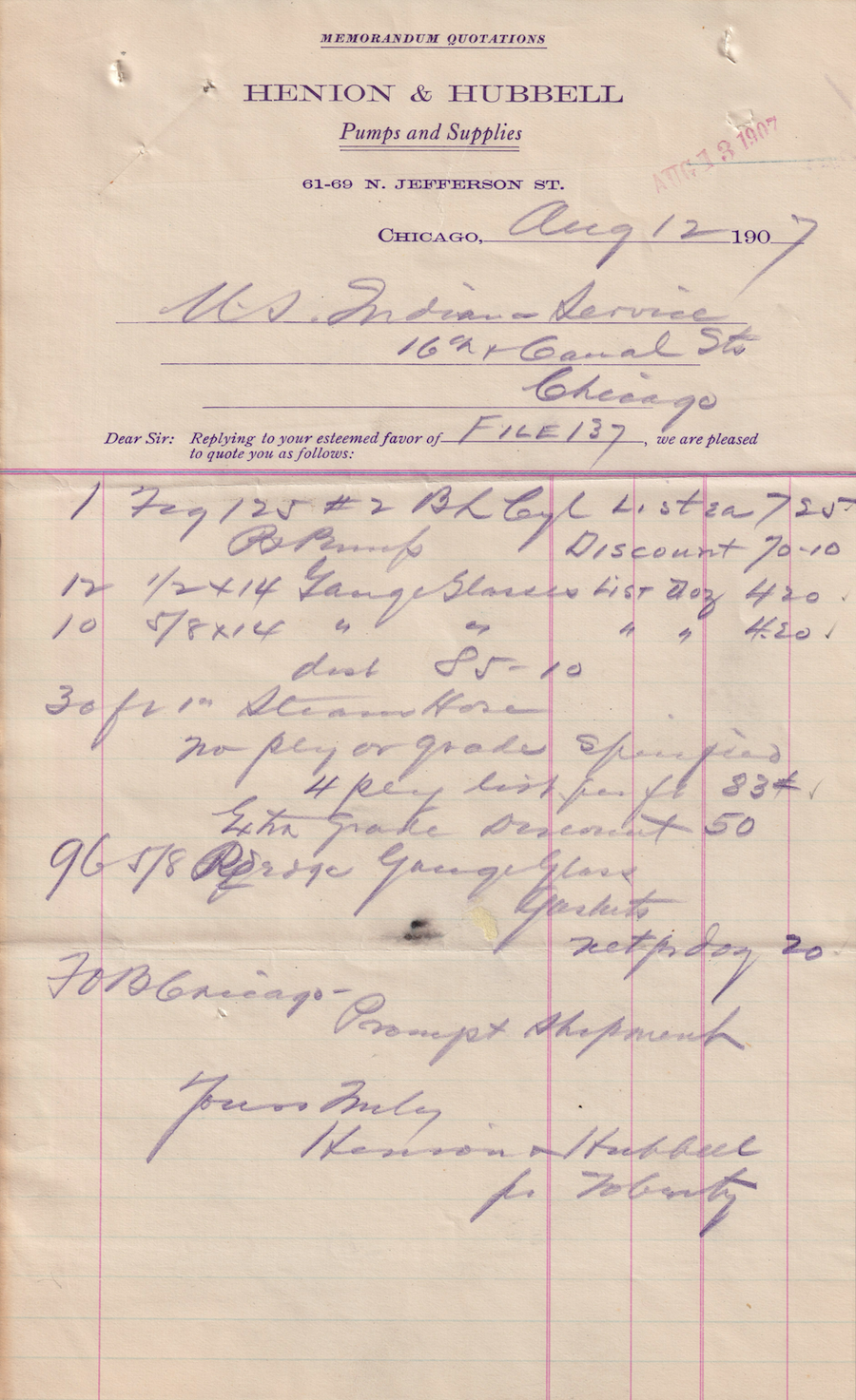 Memorandum from unknown to the U.S. Indian Service, 12 Aug. 1907