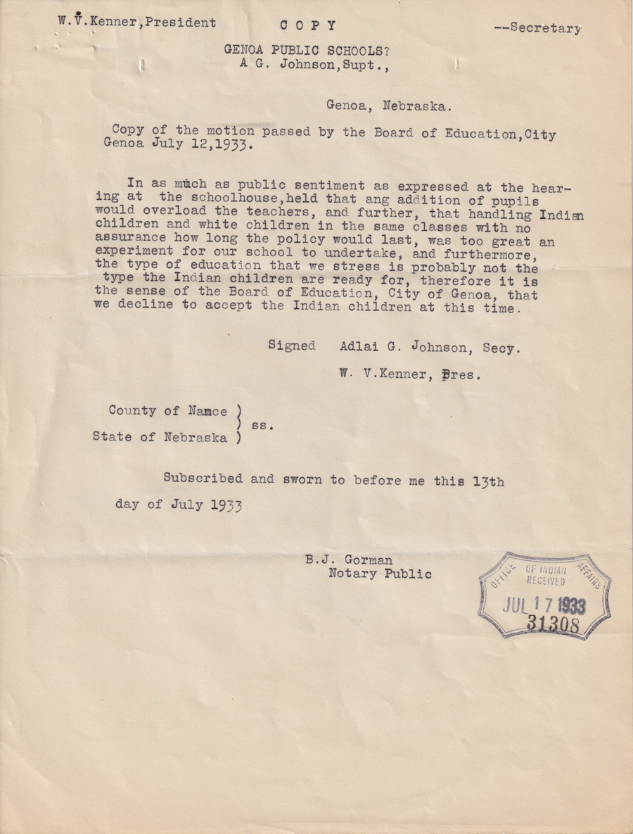 Motion from the Board of Education in Genoa, 12 July 1933; Folder: 31308-1933-803, Box 20; Central Classified Files, 1907–1939 (NAID 300324); Office of Indian Affairs; Record Group 75; National Archives and Records Administration-Washington, DC.