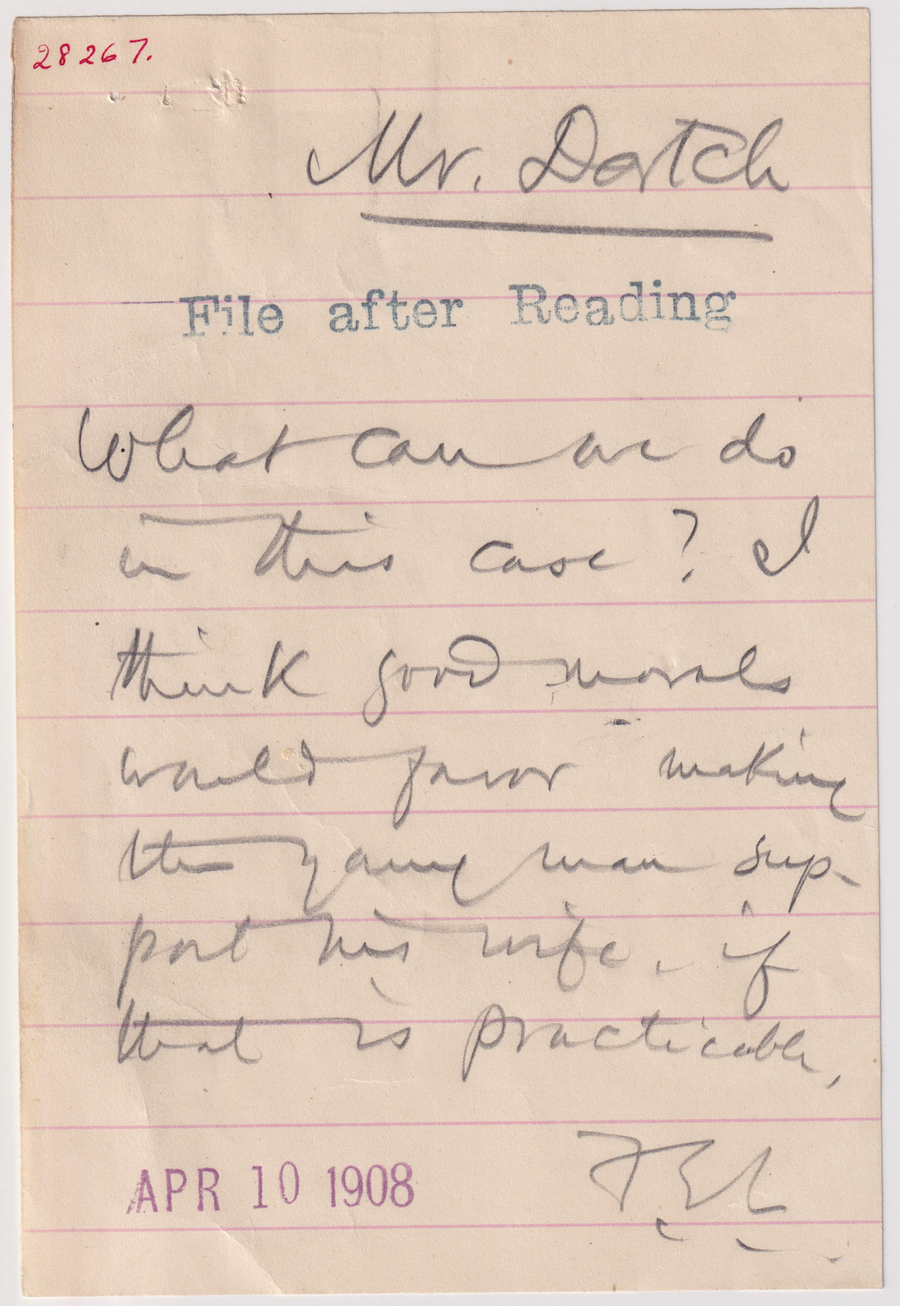 Note to Mr. Dortch from unknown, 10 Apr. 1908; Folder: 28267-1908-740, Box 20; Central Classified Files, 1907–1939 (NAID 300324); Office of Indian Affairs; Record Group 75; National Archives and Records Administration-Washington, DC.