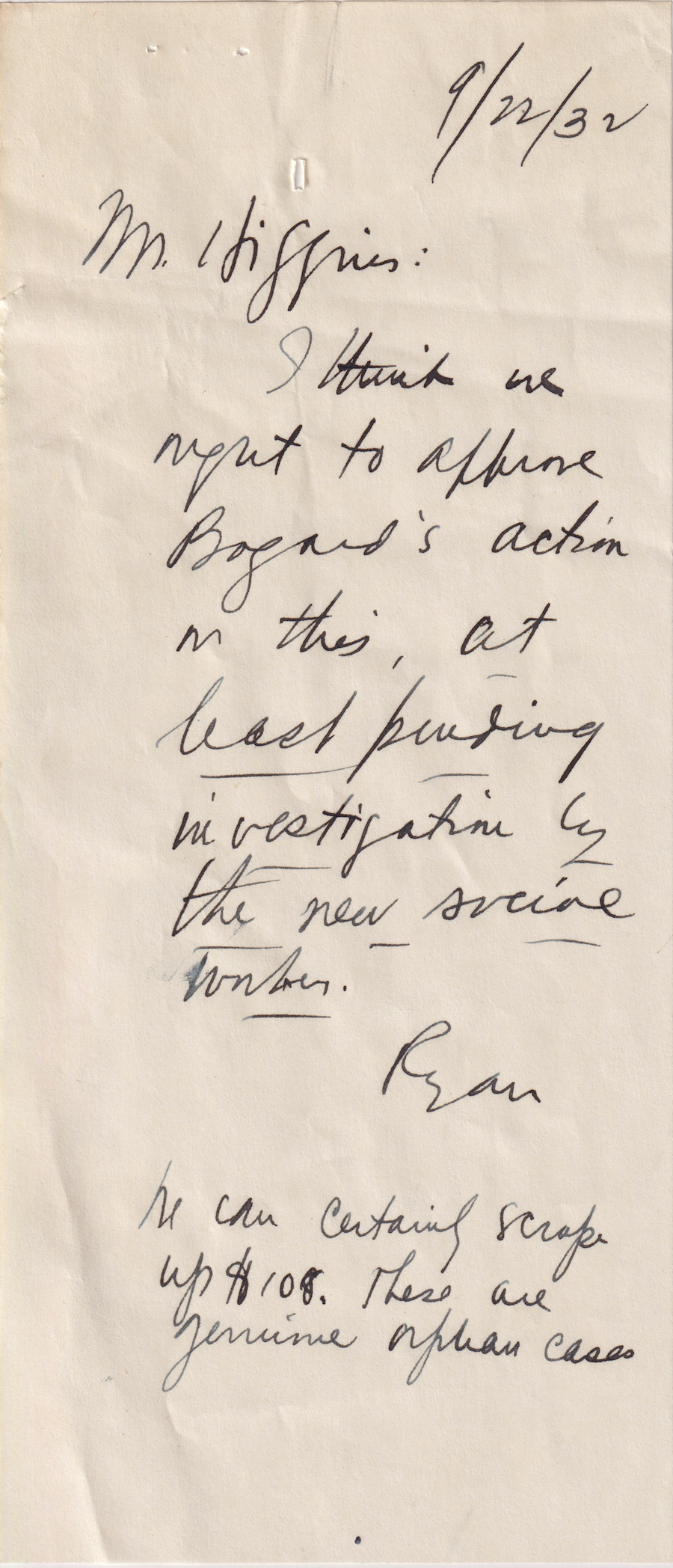 Note to Mr. Higgins from Ryan, 22 Sept. 1932